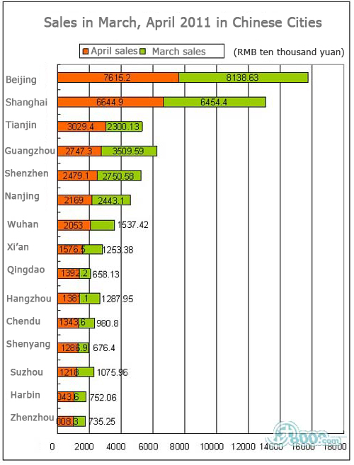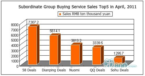 Group buying sales in Guangzhou fell to RMB 27.5 million (US$ 4 million) in April, down 25% from March, after being stagnant for the past few months. Beijing volume is down 6% month-on-month to RMB 76.15 million (US$ 11.7 milion) in April, and Shanghai claimed RMB 66.45 million (US$ 10 million) in online deal sales in this April, down 3% from March.