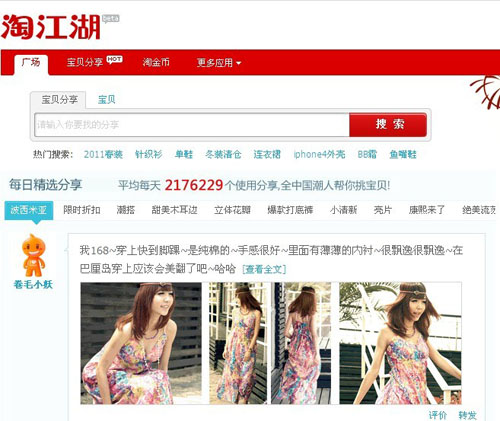 The lackluster ranking speaks to Taobao’s setback in social shopping. It’s rumored that Taojianghu would be shut down in May except for keeping three features including Juhuasuan (a taobao group buying trial), Taojinbi (attracting active users with bonus gifts ) and Taofenxiang (shopping experience sharing). As you can see, the lately revamped site boasted links to these three functions featured on the main navigation bar, though the in place SNS elements were hid deeply instead of being totally removed.